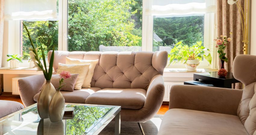 Das lichtdurchflutete Wohnzimmer mit Blick in den Garten lädt ein zu gemeinsamen Abenden auf der Couch – ob bei einem guten Film, mit einem Buch, bei einem Spieleabend oder einem kühlen Getränk.